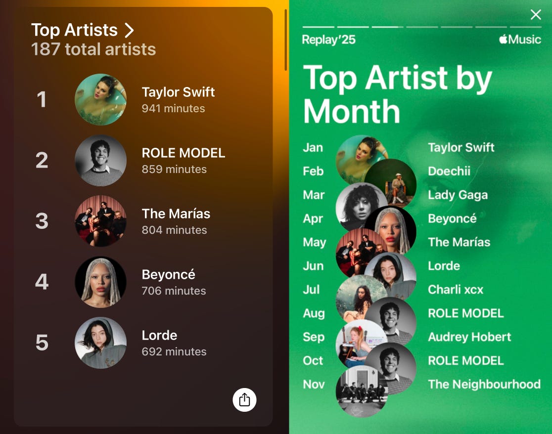 I glance at the other artists in my Top 5, and it gets worse. Number two is Role Model. I scrunch up my nose. Number three is The Marías. Better! Number four is Beyoncé, and number five is Lorde. Not amazing, but not terrible either. Squarely in the middle tier of pop fans. Not a complete social pariah (I’ve never listened to a Morgan Wallen song, I can’t conjure an image of Alex Warren or Nessa Barrett), but not a generational tastemaker either. Fortunately, my top albums and top songs are much more palatable. There isn’t a single Taylor Swift song in my Top 100 songs of the year, leading me to think she slipped Apple Music some cash under the table.