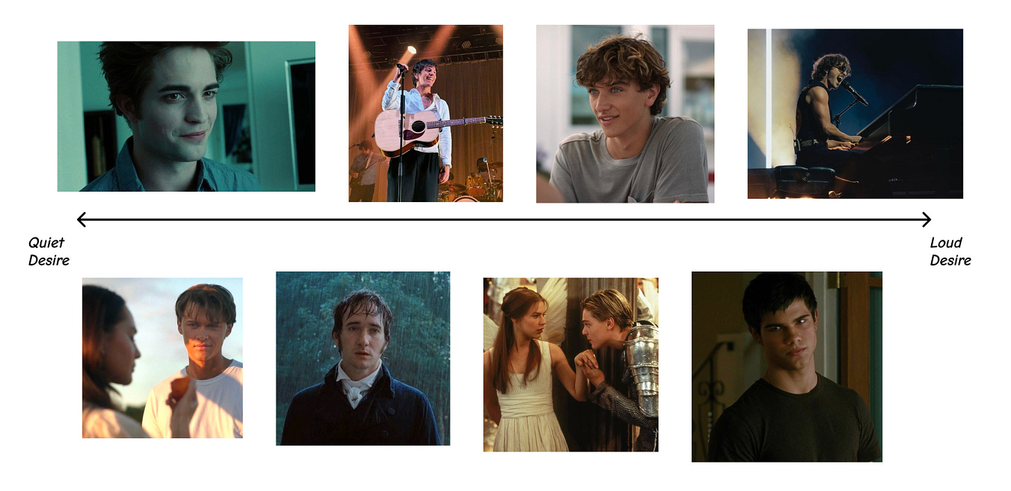 “Yearners,” in literature and onscreen, are revered for their more controlled displays of affection over noisy disclosures of desire. Like Valerie’s definition, this charm is embodied through the act of caring for someone to a degree that one is willing to sacrifice one’s own happiness. In many works, this manifests in the yearner’s acceptance of pain, and even banishment, often to their own detriment, and to the benefit of the object of their affection. Romeo skips town, Mr. Darcy doesn’t own up to his good doings. Edward Cullen runs away when he realizes his presence will only put Bella in danger. And, most recently, Conrad Fisher, the favored brother in the series The Summer I Turned Pretty, estranges himself from his family to keep peace with Belly, the love of his life, who’s marrying his brother (Austenian, I know).