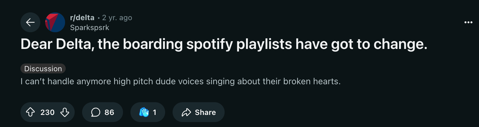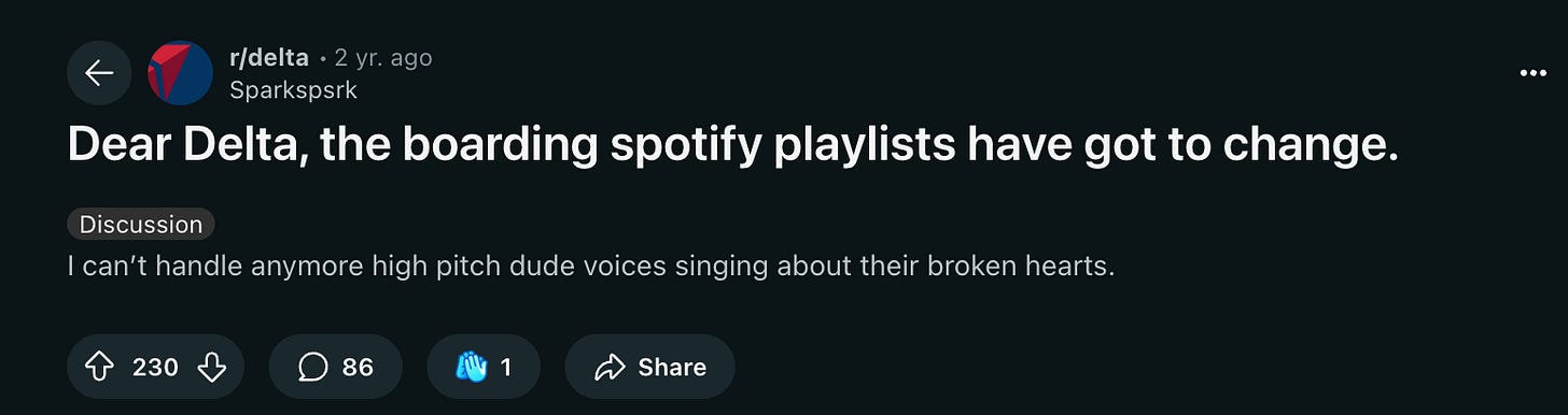 You are already exhausted from travel, but this music somehow emphasizes that, slipping a few bricks into your backpack. You wonder who on Earth hurt the Delta employee in charge of making this playlist so badly that everyone on every Delta flight needs to suffer in perpetuity. You exit the plane, pop in your earbuds, and begin playing literally any other artist.